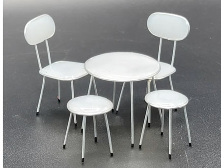 Työvälineet: perustyövälineet, leivinpaperia, kuumaliimapyssy (mielellään paksuille tangoille), sytkäri tai kynttilä, mustaa maalia + sivellin tai mustaa kynsilakkaa, halkaisijaltaan n. 25-30 mm kokoinen korkki tms. tuolien jigiksi ja halkaisijaltaan n. 20 mm pyöreä keppi ja 50-60 mm kokoinen purkin kansi tms. pöydän kannen jigiksi.